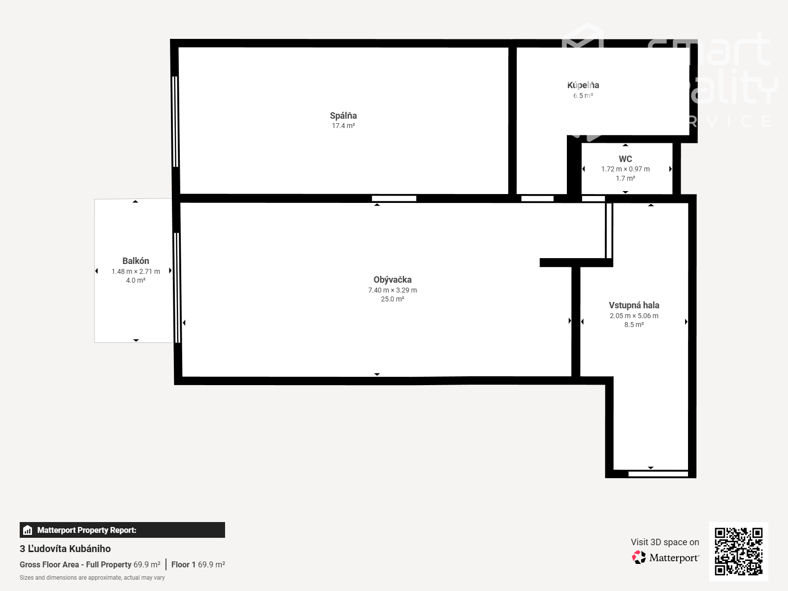 Byt má celkovú výmeru 63 m² vrátane balkóna a nachádza sa na 2. nadzemnom podlaží moderného bytového domu s výťahom.